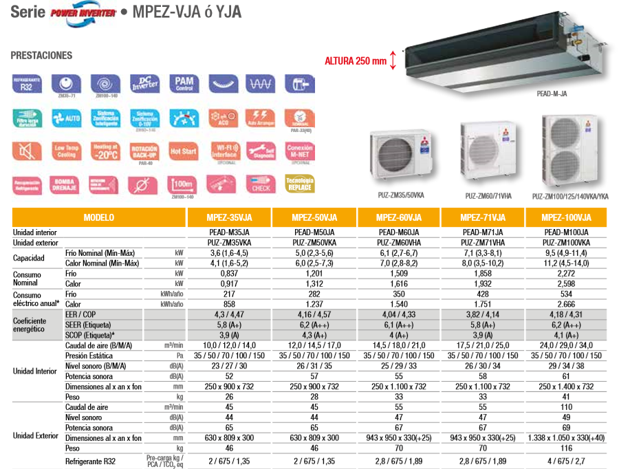 Aire acondicionado de conductos MITSUBISHI ELECTRIC MPEZ-100VJA POWER INVERTER con Gas Refrigerante R32 de 8.600 FRIG/H y 9.632 KCAL/H. Recomendado para estancias de 90 M2 aprox.