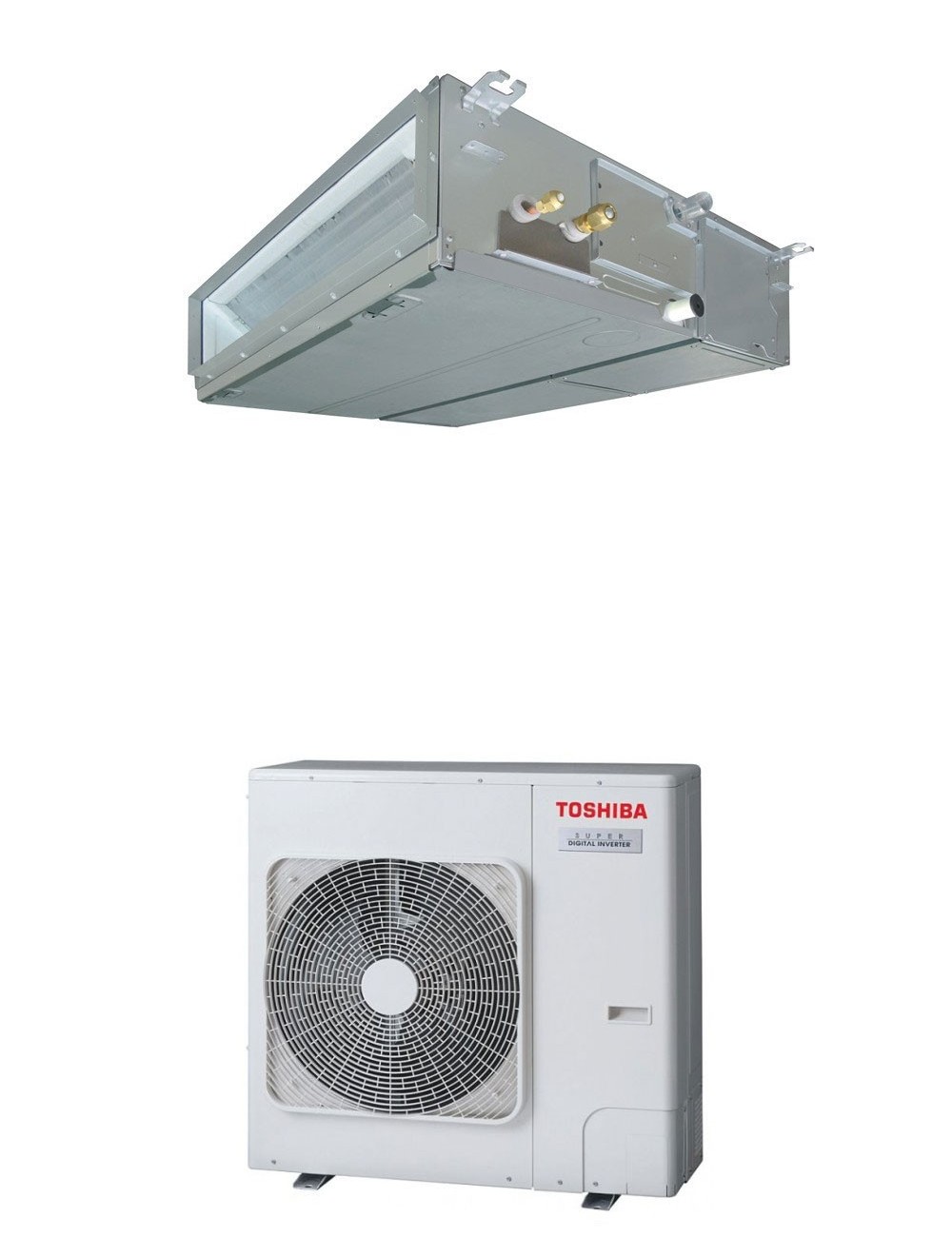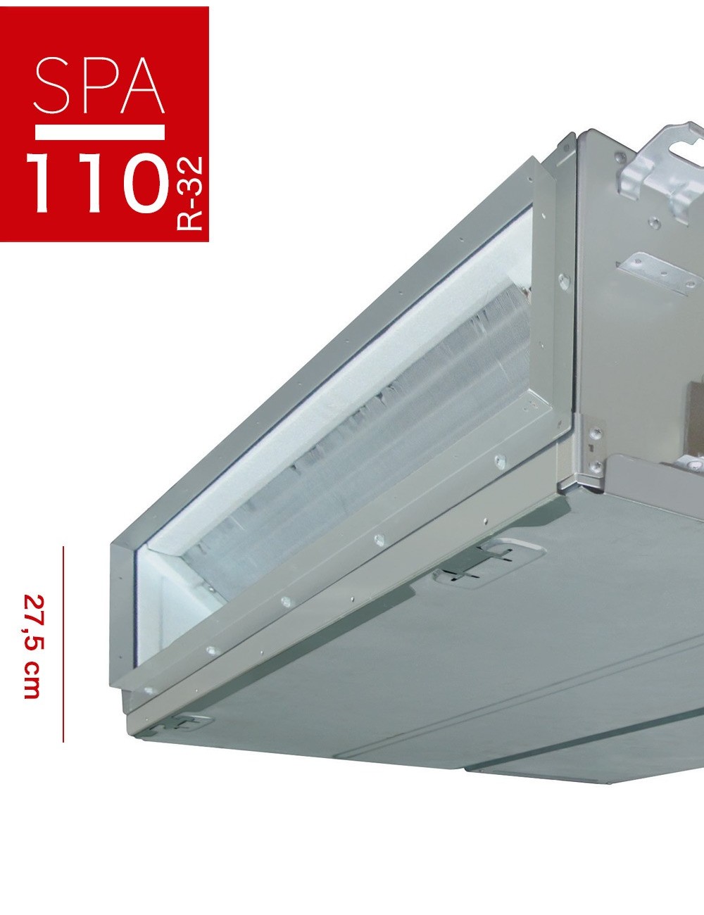 Aire acondicionado por conductos TOSHIBA SPA 110 INVERTER de gas R32, Potencia de 9,5 Kw en frío equivalente a 8.170 Frig/h y 11,2 Kw en calor, equivalente a 9.632 Kcal/h. Etiqueta energética A/A+. Ideal para estancias hasta 100 m2 aprox.